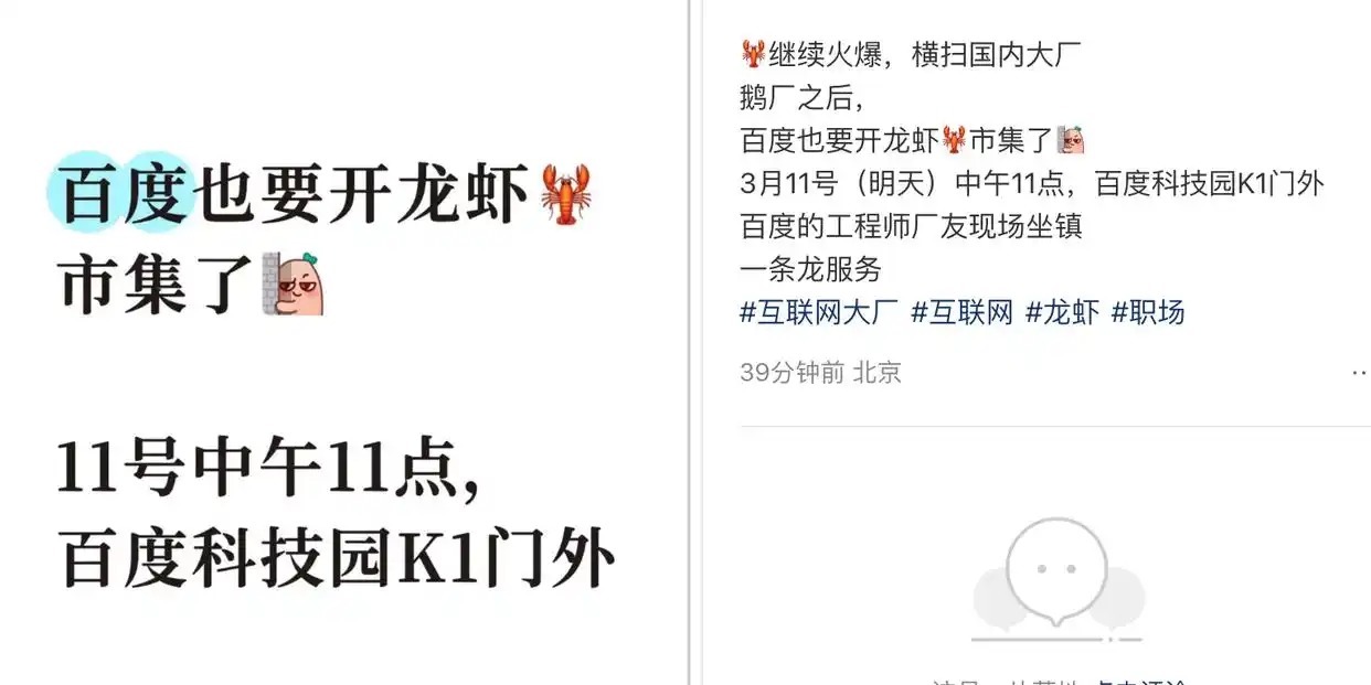 3月10日,今日,有爆料称百度将3月11日中午11点,在北京百度科技园K1门外,开启百度龙虾市集,由工程师现场坐镇,部署安装、配置OpenCloud。现场完成部署后,还可以领取专属的小龙虾养殖证书。
