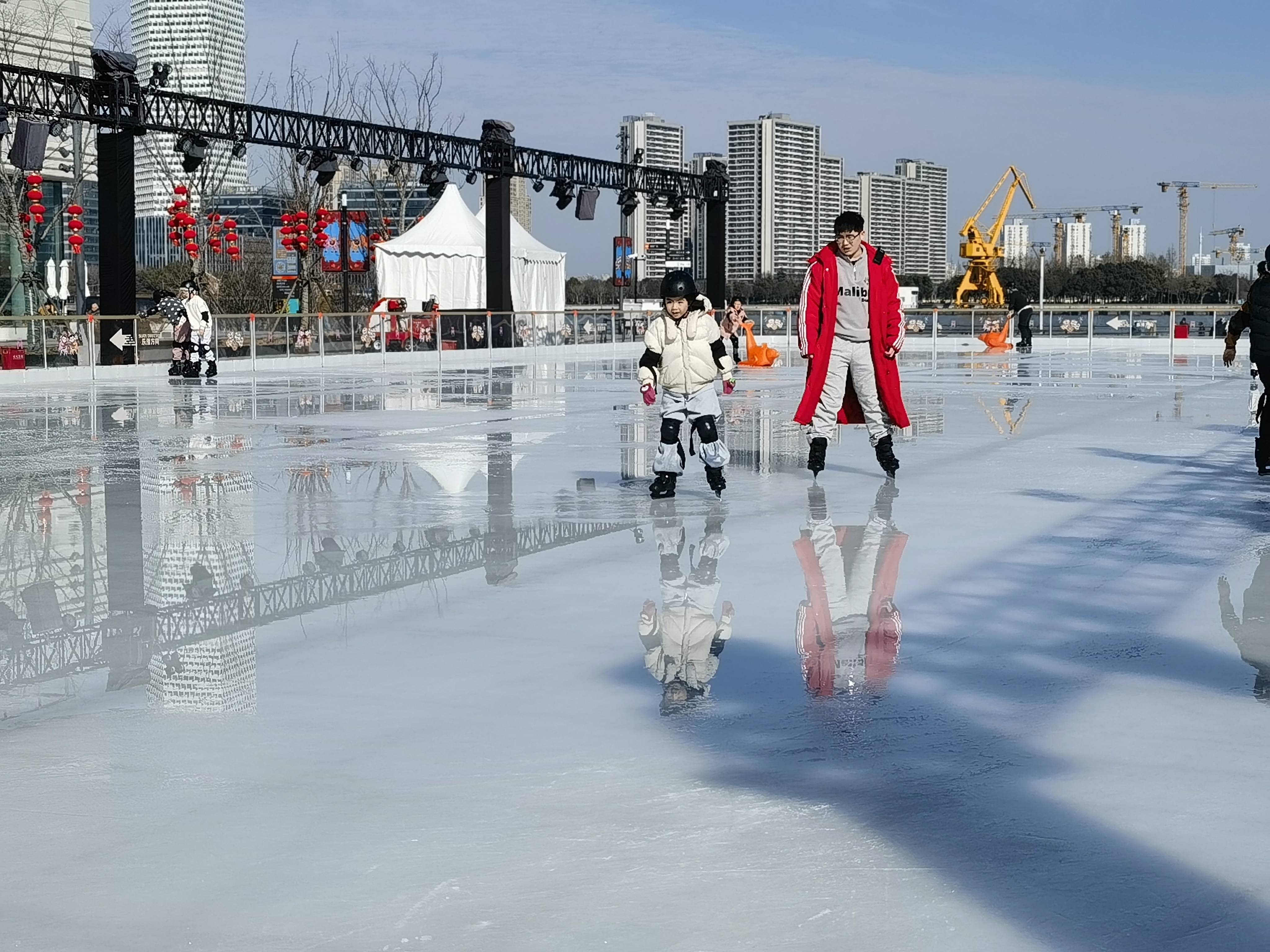 在上海徐汇滨江西岸梦中心,面积约为1500平方米的户外水岸冰场充满欢声笑语。即便是工作日,也有不少家长带着放寒假的孩子前来滑冰。