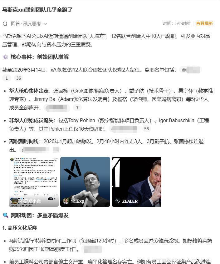 那是马斯克错了?要知道,一家聚焦前沿AI的创业公司,超80%的核心天才集体出走,而他们选择离开的,还是那个凭借特斯拉、SpaceX改写行业规则,被贴上疯狂、天才、改变世界标签的埃隆·马斯克。
