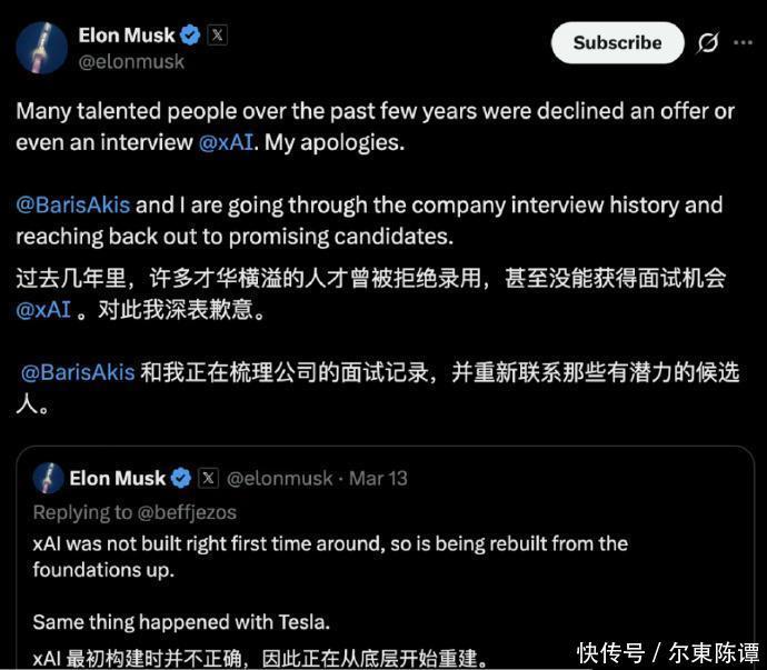 面对如此大规模的核心人才流失,一向以强势、骄傲著称的马斯克,也罕见地低下了头,公开发文为团队动荡致歉。